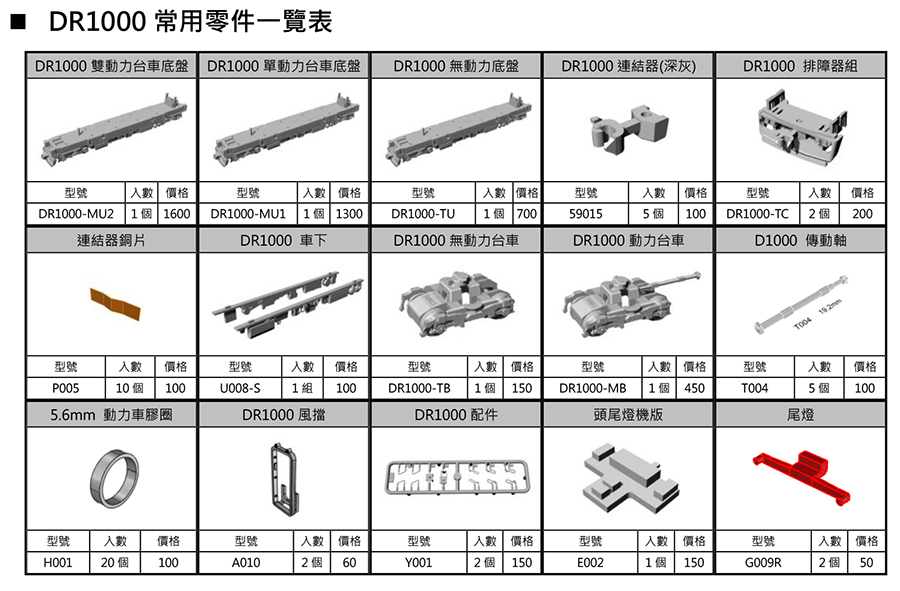 ・使用DR1000-MU1底盤,包含馬達+動力台車 x1 (同實際車輪配置)