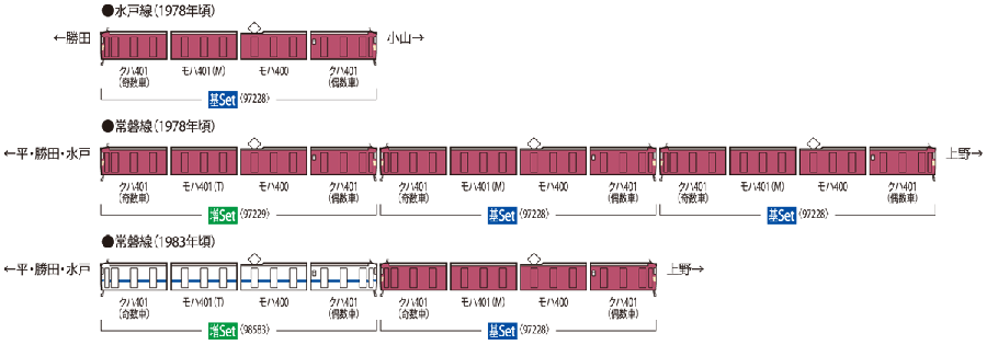 ●再現國鐵401系中,駕駛車クハ401為高運轉台版本,塗裝為交直流標準色「紅13號(玫瑰粉紅)」
