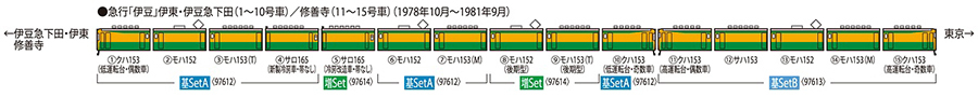 ●由クハ153、モハ152・153與サロ165組成的7輛編成,本產品即可再現房總地區的急行列車,搭配<97613><97614>可再現15輛編成的急行「伊豆」