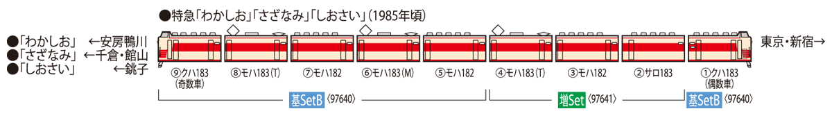●<97641>:Moha 182・183-0 與 Saro 183-0 各 1 輛,共 3 輛增結組 與<97639>或<97640>組合,可再現含綠色車廂的 9 輛編成
