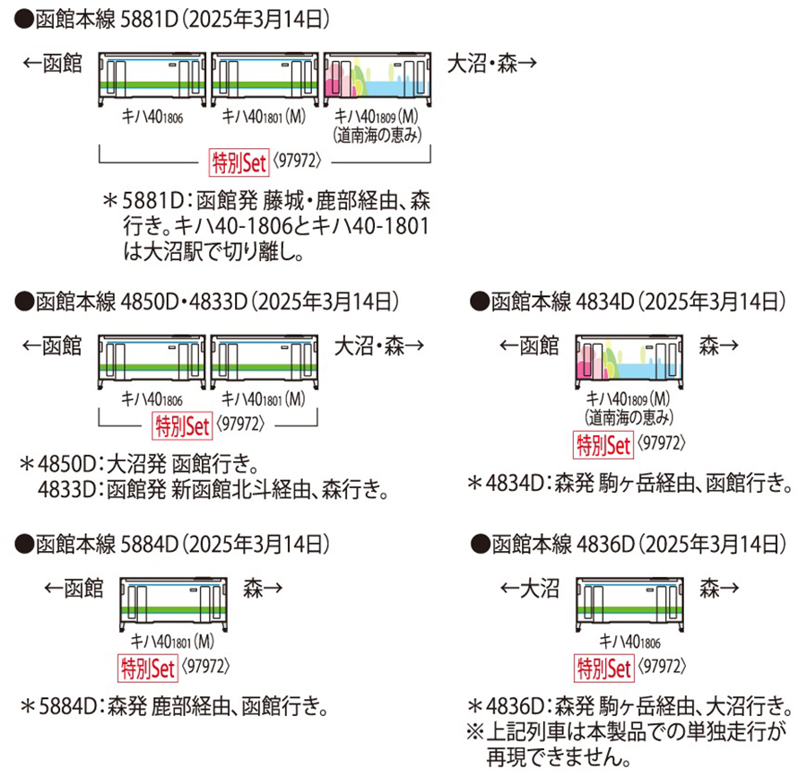 ●再現2025年3月14日定期運行最終日,於5881D列車上服役的3輛自函館出發,經藤城、鹿部前往森的車輛,並於當日整天活躍的樣貌