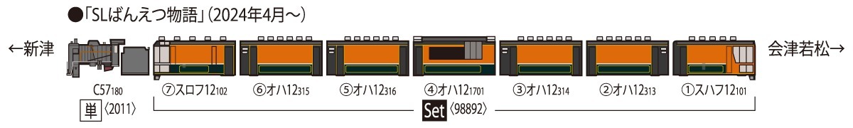 ●SL磐越物語號是隨著C57-180蒸汽機車於1999年復活而開始運行的列車,到了2014年,增設了「雪白貂(オコジョ)」展望車,並以七節車廂的編成活躍於鐵道上。