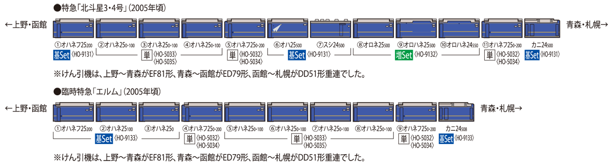 ●由 JR 東日本所屬車輛單獨編成的北斗星,曾於:3 往返時期的北斗星 3~6 號,2 往返時期的 3・4・81・82 號。