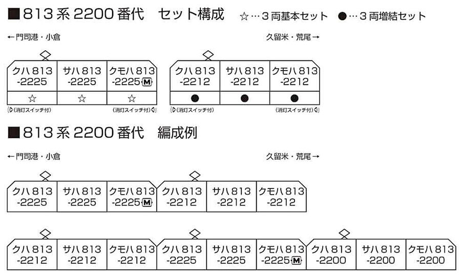 ◆將新規製作JR九 州813系中將座位改成了長椅的2200番 台。您可與發售中的〈10-1540/1541 787系<AROUND THE KYUSHU>〉等九州地區的車輛進行搭配。