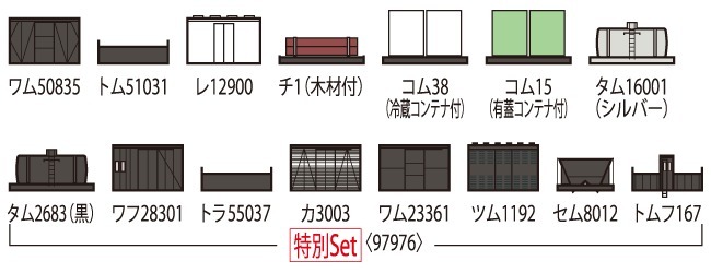 ●本套組以 1976 年 Tomix 創立時的產品陣容中 15 種兩軸貨車 為基礎,其中部分車型以外觀相近的貨車進行再現。